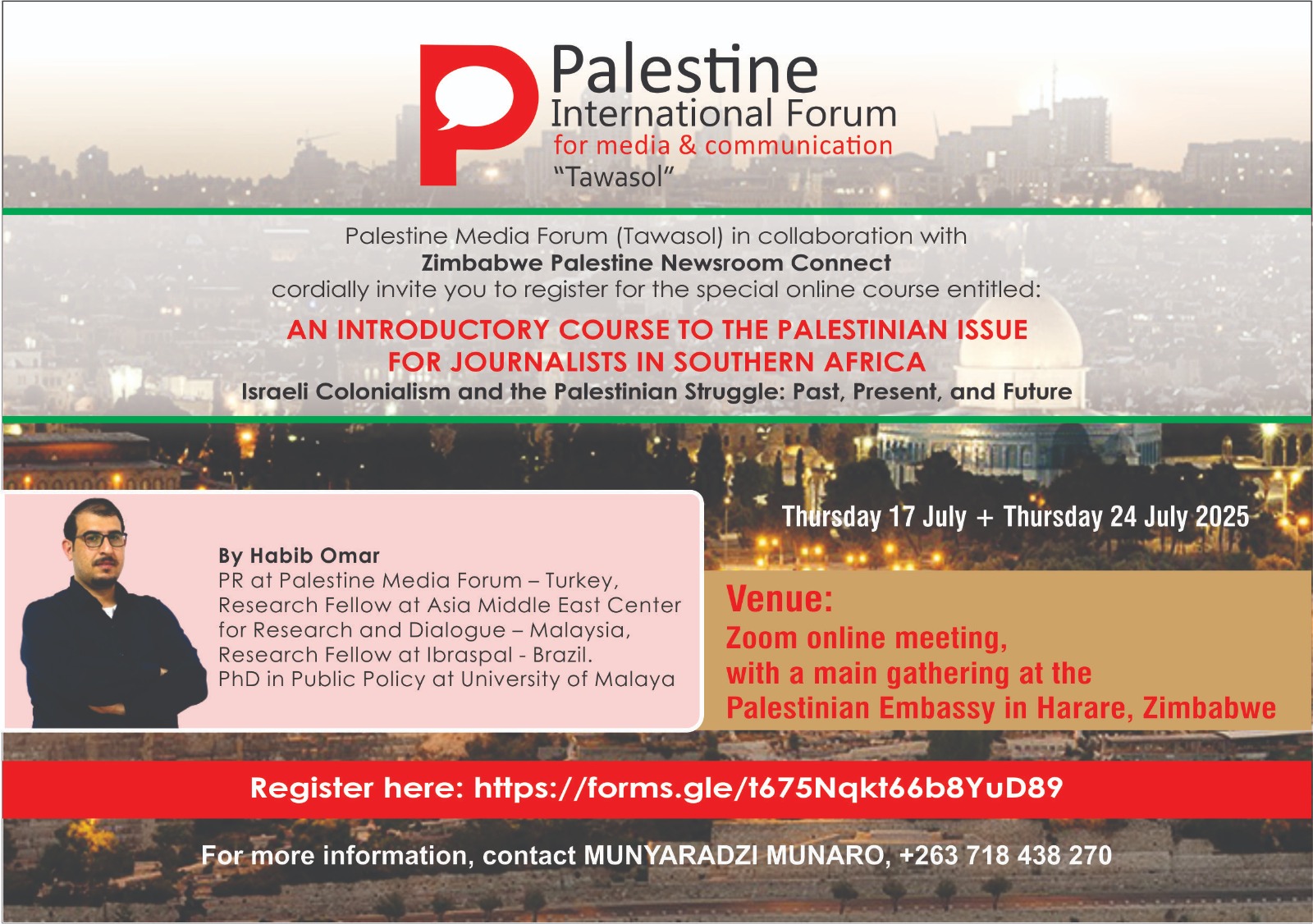 Palestine Media Forum (Tawasol) in collaboration with Zimbabwe Palestine Newsroom Connect cordially invites you to register for the special online course entitled: